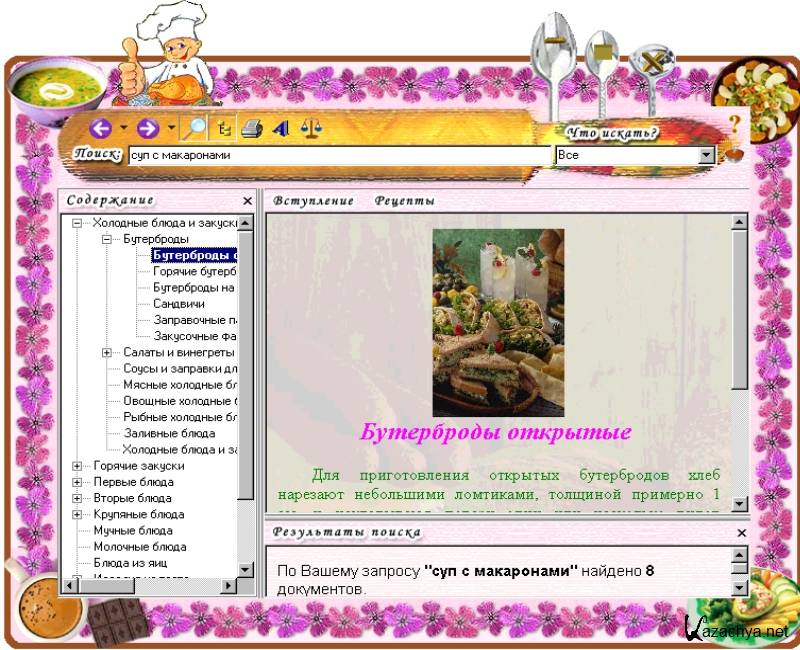 Здесь Вы можете найти множество различных кулинарных рецептов практически на все случаи жизни. Удобная интеллектуальная поисковая система поможет Вам подобрать блюда, которые можно приготовить из имеющихся в Вашем холодильнике продуктов, найти конкретный рецепт по его точному или приблизительному названию; а удобный классификатор (содержание) позволит быстро и просто сориентироваться в многообразии блюд.