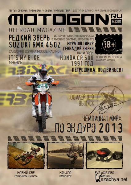 Motogon offroad magazin - первый российский журнал посвященный мотоциклетному внедорожному спорту. На страницах журнала вы найдете: независимый взгляд на новейшие мотоциклы и обзоры старых моделей. Тесты экипировки и интервью с известными спортсменами. Репортажи с самых интересных гонок и рассказы о истории внедорожного спорта. Мотокросс и эндуро, ралли-рейды и супермото, FMX и мототриал, кросс на ATV и снегоходах...Мы знаем об этом все!