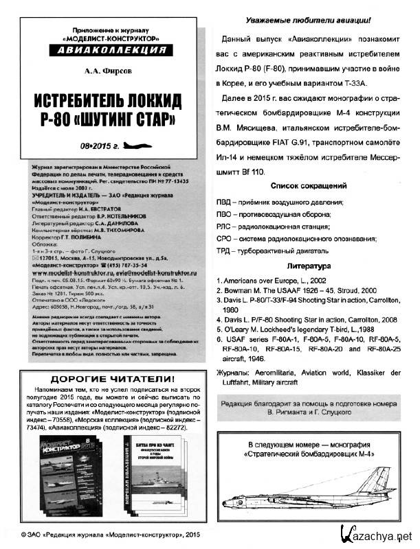 Приложение к журналу «Моделист-конструктор». Специализированный журнал для любителей истории авиации и авиамоделистов. Каждый выпуск - это мини-монография об отечественной или иностранной конструкции летательных аппаратах. Каждый выпуск содержит информацию об истории создания самолета или вертолета, его серийном производстве, модификациях, эксплуатации, боевом применении и окраске. Приводятся краткое техническое описание и чертежи машины. А также большое количество фотографий, в том числе фотоснимки узлов и агрегатов. Данный выпуск познакомит вас с американским реактивным истребителем Локхид Р-80 (F-80), принимавшем участие в войне в Корее, и его учебным вариантом T-33A.