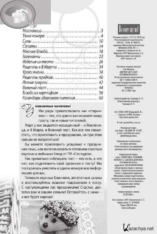 Кулинарный журнал для любителей вкусно приготовить, вкусно поесть, вкусно и оригинально принять и угостить друзей. Рассказывает как принимать гостей и сервировать стол, предлагает кулинарные рецепты изысканных, повседневных и, главное, простых и доступных блюд. Полноцветное красочное издание для настоящих радушных хозяек.