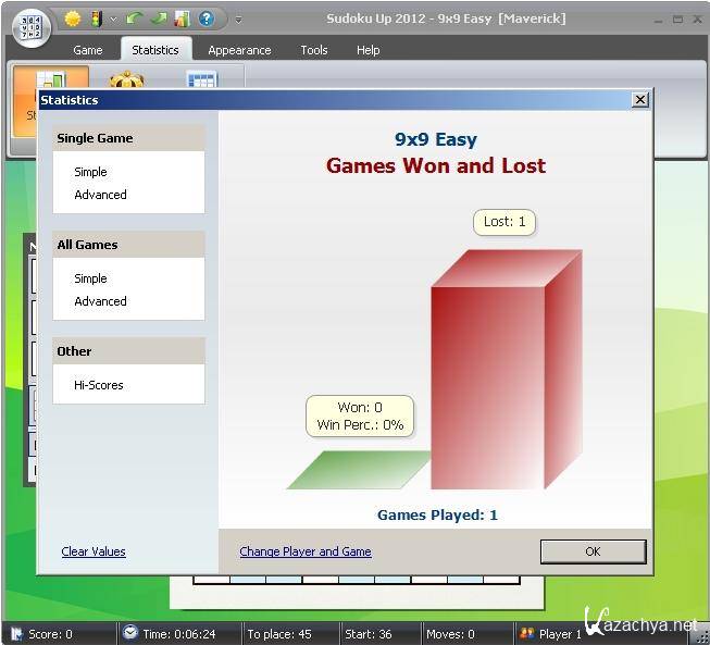 Sudoku Up 2012 includes millions of different puzzles to keep you entertained for years to come... No need to search for other sources of Sudoku! Sudoku Up includes five difficulty levels to challenge you. Enjoy the detailed statistics of each game with graphs, 3D pie and bar charts, and tables to estimate your skill level. Options include total games, current session, series of wins and losses, player's games won, players' scores and hi-scores, statistics for all games, won and lost games, and skipped games.