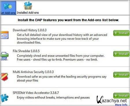 Download Accelerator Plus( DAP) - эффективный и весьма популярный менеджер закачек, который ускоряет процесс скачивания из сети Интернет, разделяя файл на части и ведя его загрузку в несколько потоков одновременно. При этом уменьшается общее время загрузки и ускорение может быть довольно значительным. Легко встраивается в самые популярные браузеры и поэтому не требует отдельного запуска, при желании можно настроить его работу в автономном режиме.