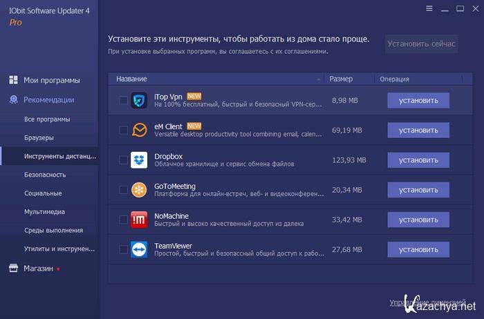 IObit Software Updater также предоставляет для установки необходимое программное обеспечение: браузеры, безопасность, социальные сети, мультимедиа, а также утилиты и полезные инструменты. Вы можете легко и быстро установить все необходимые вам программы в один клик. Это может быть удобно, когда вам нужно установить много программ, особенно когда вы настраиваете новый компьютер или переустанавливаете систему.