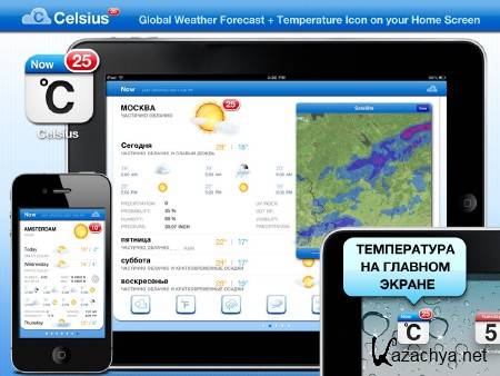Цельсия - потрясающее новое приложение для погоды, которое использует новейшие технологии, чтобы показать вам текущую температуру в любом месте прямо на вашем iPhone / рабочем столе Вашего IPad. Помимо температуры в реальном времени, на рабочем столе по Цельсияу также находится приложение о погоде номер один, которое предоставляет вам многочисленные подробные сведения о погоде неограниченного количества городов мира, упакованные в великолепный дизайн и пользовательский интерфейс!