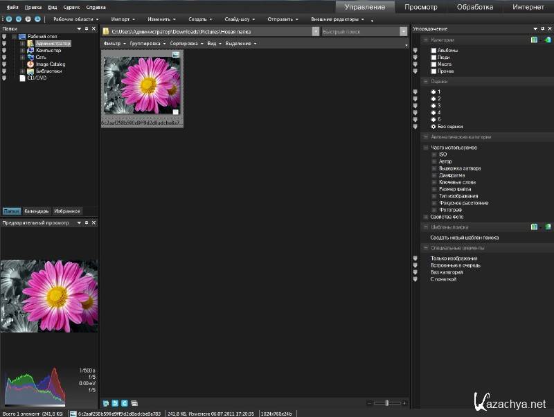 в том числе и в RAW формате. Кроме того, здесь присутствуют инструменты для независимого регулирования цветовых каналов, исправления артефактов фотографий, появляющихся из-за погрешностей оптики, добавления "водяных знаков", работы с IPTC-метаданными, имеется возможность архивирования графических коллекций в ZIP-файлы, запись на CD или DVD и многое другое.