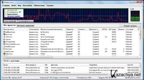 Process Lasso (x32) and (x64) - Позволяет вручную или автоматически манипулировать запущенными на компьютере процессами, что позволяет добиться максимального быстродействия и стабильности системы. Process Lasso наблюдает за программами, активно загружающими центральный процессор и ограничивает их, тем самым улучшая системный отклик. Также она может автоматически снизить приоритет для процесса, применив заданные по умолчанию значения. Эта утилита не претендует на замену стандартному Диспетчеру задач Windows, она является лишь дополнением к его функциям. C помощью Process Lasso можно отключить любой процесс (например, если он полностью загрузил процессор), создавать списки разрешенных и запрещенных к запуску процессов, а также вести детальную запись работы всех процессов.
