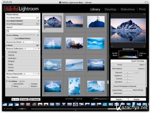 Lightroom объединяет фотографии в «коллекции» — виртуальные сборища файлов, по которым может быстро делать поиск. Он хранит информацию о ключевых словах, превью и метаданных не в каждом графическом файле, а в централизованной базе данных (движок SQLite). Поэтому к базе можно обращаться и по поводу фотографий, которые сейчас в архиве на DVD. Размер программы существенно меньше, чем у Bridge, запускается она быстрее и занимает меньше оперативной памяти. В общем, Lightroom расчитан исключительно на фотографов, которых интересует обработка и каталогизация фотографий, а не интеграция всего и вся. Другая особенность пакета Photoshop Lightroom — разделение процесса работы со снимками на отдельные этапы. Для каждого из них предназначен свой функциональный модуль с соответствующим набором инструментов и палитр настроек.