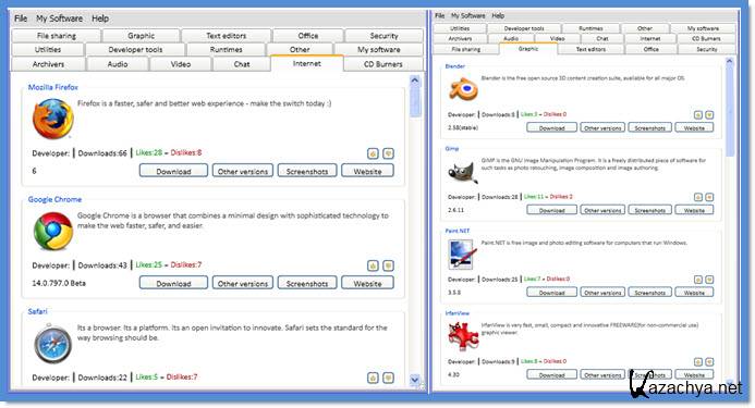 Все имеющиеся в каталоге программы разделены на 16 разделов: архиваторы (Archivers), аудио (Audio), видео (Video), запись дисков (CD Burners), графика (Graphic), офис (Office), безопасность (Security), интернет (Internet), пиринг (P2P-File sharing), игры (Games), IM-чаты (Chat-IM) и т.д.