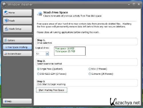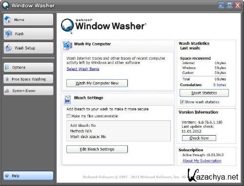 Webroot WindowWasher вер 6.6 license 2012 г Эта программа имеет улучшенный interface. На первый план вынесены основные настройки Washer и вам не придётся долго разыскивать ту или иную настройку - всё видно. Если вам частенько возникает необходимость чистить жесткий диск, выбираете опцию постоянной проверки диска на не нужные файлы, после того внизу окна этой программы будет отсчитываться время до времени новой проверки!!