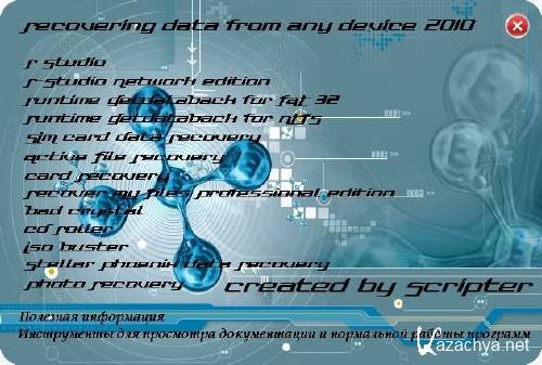 Данный диск содержит программы для восстановления данных с жесткого диска файловых систем Windows и Linux,поцарапанных CD,DVD дисков,USB Flash накопителей,различных карт памяти,фотоаппаратов,MP3 плееров,для восстановления данных с сотовых телефонов,так же на диске Вы найдёте программы для восстановления SMS,номеров телефонов с SIM карты и программу для восстановления застрявшего пикселя и уменьшения теных пятен на мониторе.