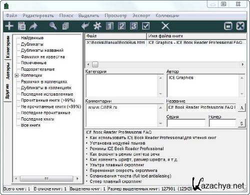 ICE Book Reader - программа для всех тех, кто предпочитает читать электронные версии книг вместо их бумажных аналогов. ICE Book Reader Professional поддерживает множество форматов (TXT, RTF, HTML, MS Word, PALM books (.PDB и .PRC), LIT), умеет читать файлы из архивов ZIP, RAR, ARJ, LZH, HA без использования внешних архиваторов.