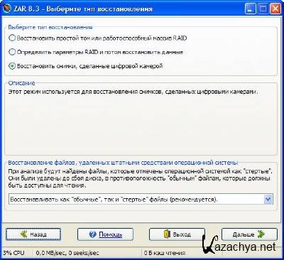Дополнительные возможности и особенности: Сохранение восстановленных данных на ftp-сервере. Сжатие восстанавливаемых файлов в zip архив. Отложенное сканирование. Диагностика диска.Zero Assumption Recovery 8.3 build 29 - Программа для восстановления данных с поврежденных жестких дисков и последующей их записи на другие носители информации. Может работать с длинными именами файлов и различными языками (включая русский), поддерживает NTFS-компрессию. Есть режим восстановления цифровых фотографий и автоматический поиск потерянных разделов.