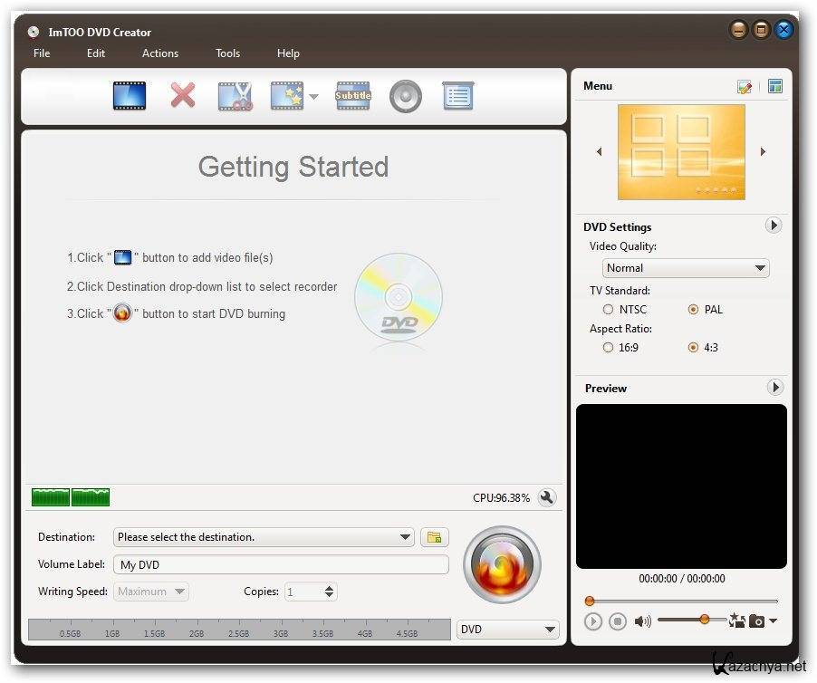 ImTOO DVD Creator - это практичная программа для записи на DVD, способна конвертировать все существующие известные видео форматы в DVD и записывать на DVD. Программа создания DVD позволит вам с лёгкостью определить NTSC или PAL форматы, настроить 4:3 или 16:9 видео коэффициент пропорциональности и записать на DVD диск или в ISO файл с видео файлов. Эта программа также предоставляет вам множество отличных DVD меню для авторизации DVD. Так что вы можете с легкостью использовать и быстрее чем раньше, просто один щелчок, чтобы создать и записать DVD.