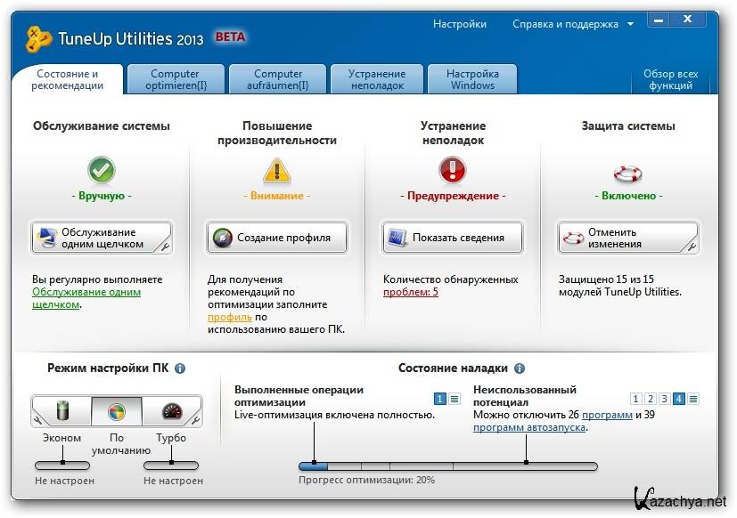 Новый интерфейс TuneUp запускает функции и выполняет поставленные задачи быстрее, чем когда-либо. Кроме того, на нем четко отображается, требуется ли компьютеру оптимизация, и были ли обнаружены проблемы в Windows. Блестящее решение: интерфейс запуска TuneUp предоставляет мгновенный доступ к лучшим функциям TuneUp Utilities, таким как обслуживание одним щелчком, режим Turbo, Live-оптимизация и режим экономии TuneUp.