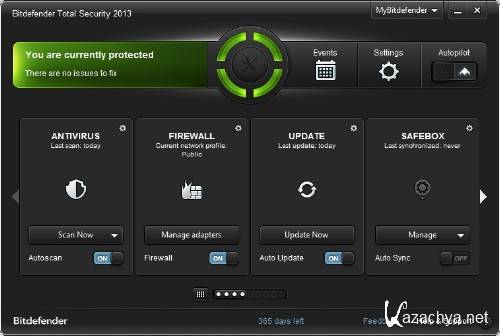 Bitdefender Total Security 2013 - решение безопасности "все-в-одном" с облачным антивирусом, эффективной веб-защитой, двусторонним фаерволом, комплексной защитой персональных данных: антифишинг, безопасный браузер, шифрование, онлайн резервное копирование.