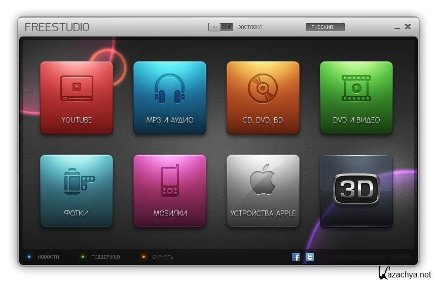 Free Studio содержит 8 разделов: YouTube, MP3 и Аудио, CD-DVD-BD, DVD и Видео, Фотографии, Мобилки, Устройства Apple, 3D, которые включают в себя 45 программы. Удобный интерфейс позволяет быстро и без проблем найти и запустить нужную именно вам. Добавились 2 новые программы: Free Video to Sony PlayStation Converter и Free Video to Nintendo Converter.