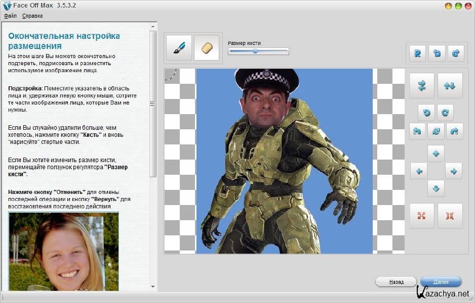 Face Off Max - уникальное приложение которое может помочь Вам сделать фото, к примеру наложив свое или чьё то лицо на чужую фотографию. Разве вы ни когда-нибудь не представляли, как вы будете выглядеть имея любое другое тело? Не хотелось бы иметь фотографию с группой известных личностей или на обложке журнала? Теперь программа позволит вам сделать это и позабавить своих коллег, друзей. Программа имеет простой и удобный интерфейс, инструкции и сотни фантастических шаблонов, что позволит любому стать профессиональным художником.