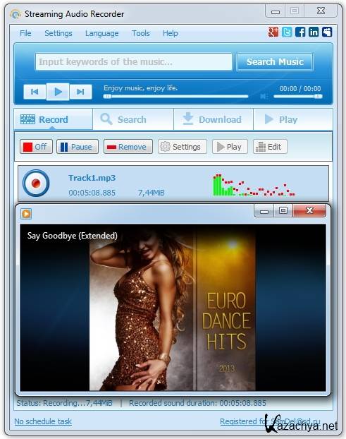 Apowersoft Streaming Audio Recorder - поможет вам записать совершенно любые звуки, которые проходят через звуковую карту вашего компьютера. Все, что вам нужно сделать, чтобы записать песню, играющую на Интернет радио – это нажать кнопку Record и сохранить её в формате MP3, WMA, ACC, OGG. Если вы занимаетесь музыкой, то вы сможете записать ваш голос через микрофон. Имеет функцию составления графиков записей, возможность приостанавливать и заново запустить запись, а также функция автоматического пропуска тишины при записи.