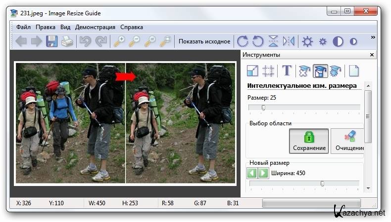Image Resize Guide - универсальная программа для изменения размеров и пропорций изображений без искажения важных для вас частей и для удаления объектов без видимых следов. Программа содержит следующие инструменты изменения размера изображения и удаления объектов: Размер, Вырезать фрагмент, Умное удаление, Умный размер, Латание. В программу интегрированы анимированные примеры обработки фотографий: простое изменение размера фото; изменение размера фото и сохранение объектов; простое удаление; удаление в два шага, удаление с защитой, латание, т е в программу включены анимированные демонстрационные примеры, которые по шагам объяснят как все это правильно сделать.