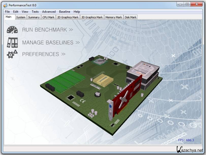 PerformanceTest - это универсальный набор тестов от компании PassMark, позволяющих оценить общую производительность вашего ПК по сравнению с другими компьютерами. Программа содержит двадцать семь стандартных тестов в семи группах, плюс еще пять для пользовательских тестов. Среди стандартных можно отметить тесты процессоров, 2D и 3D графики, дисковых накопителей, памяти, CD/DVD-приводов и многих других составляющих компьютера. Полученные результаты можно экспортировать в форматы HTML, GIF, BMP или скопировать в Microsoft Word.