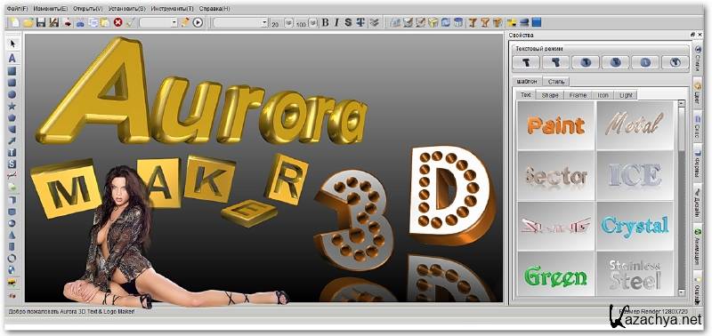 Aurora 3D Text & Logo Maker - мощный инструмент для создания уникального 3D текста, кнопок и логотипов. Программа имеет достаточно большое количество шаблонов и уже готовых форм, которые можно использовать для создания собственного текста. При желании в редакторе можно создать полностью собственный и уникальный 3D текст или логотип. Программа позволяет выбирать различные варианты искривления, выравнивания, освещения, наложения объектов и т.д. Допускается импорт шрифтов и SVG-графики. Итоговый вариант выводится в виде PNG, TGA, TIFF, JPG, BMP, XPM и PPM-файлов.