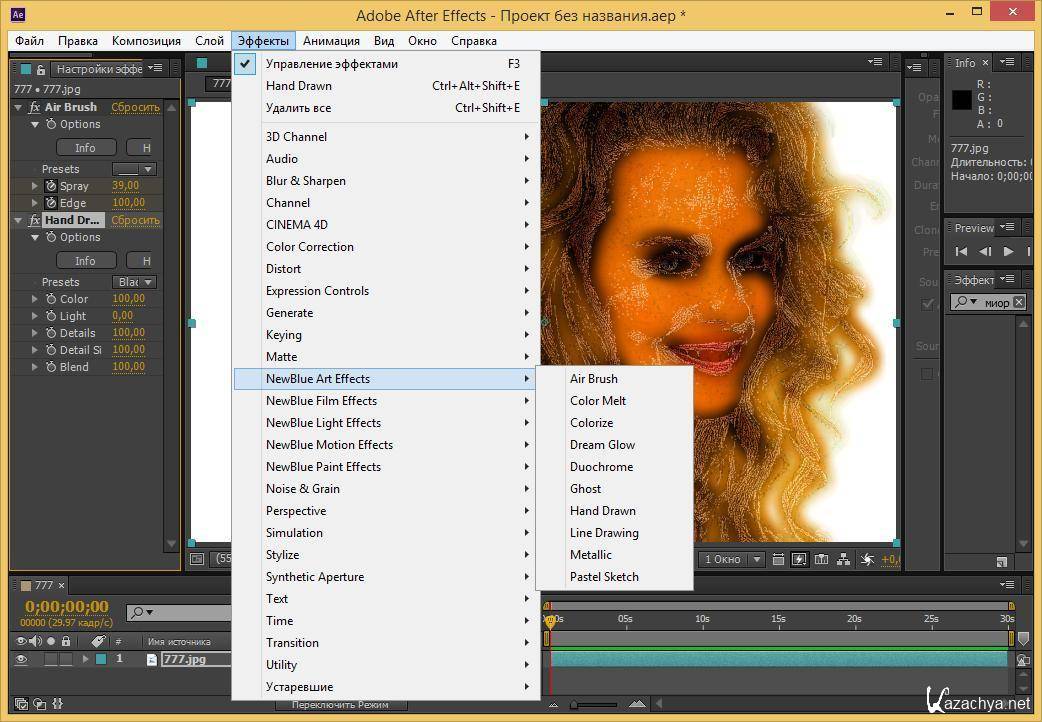 NewBlue Paint Effects — позволяет одним щелчком мыши изменять ваше видео так, что оно выглядит как живопись, рисунок или мультфильм. Эта наиболее продаваемая коллекция включает 134 пресета в 12 различных видеоэффектов и предназначена для преобразования видео-сцен в художественном стиле: мозаика, карандашный эскиз, уголь, цветной карандаш, масло, пастель, акварель и т.д. Плагин работает практически со всеми известными видео-редакторами.
