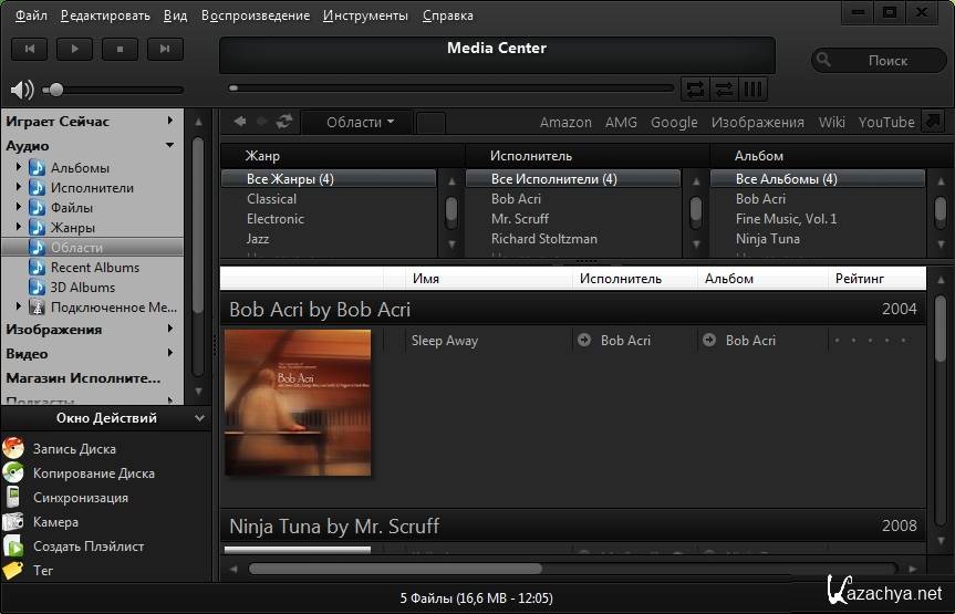 J.River Media Center - мощный мультимедийный центр, объединяющий в себе работу с музыкой, видео и фотографиями. Проигрывает большинство популярных аудио и видео форматов, включая MP3, аудио CD (поддерживает CDDB) и DVD, может преобразовывать CD-аудиотреки в WAV и MP3, переписывать на жесткий диск виниловые диски и кассеты (убирая при этом помехи и шумы), а также создавать аудио-CD, причем для всех этих функций программа имеет множество настраиваемых параметров.