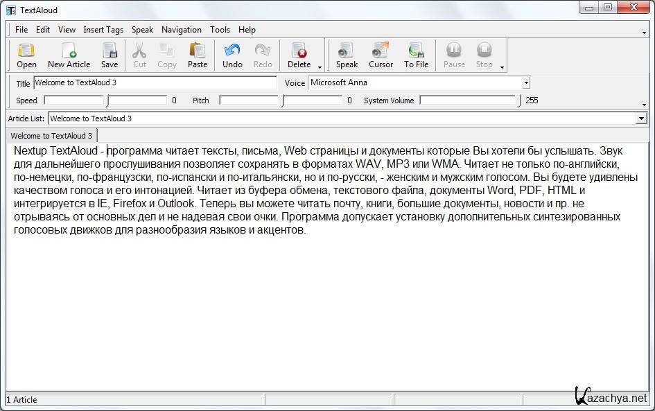 Nextup TextAloud - программа читает тексты, письма, Web страницы и документы которые Вы хотели бы услышать. Звук для дальнейшего прослушивания позволяет сохранять в форматах WAV, MP3 или WMA. Читает не только по-английски, по-немецки, по-французски, по-испански и по-итальянски, но и по-русски, - женским и мужским голосом. Вы будете удивлены качеством голоса и его интонацией. Читает из буфера обмена, текстового файла, документы Word, PDF, HTML и интегрируется в IE, Firefox и Outlook. Теперь вы можете читать почту, книги, большие документы, новости и пр. не отрываясь от основных дел и не надевая свои очки. Программа допускает установку дополнительных синтезированных голосовых движков для разнообразия языков и акцентов.