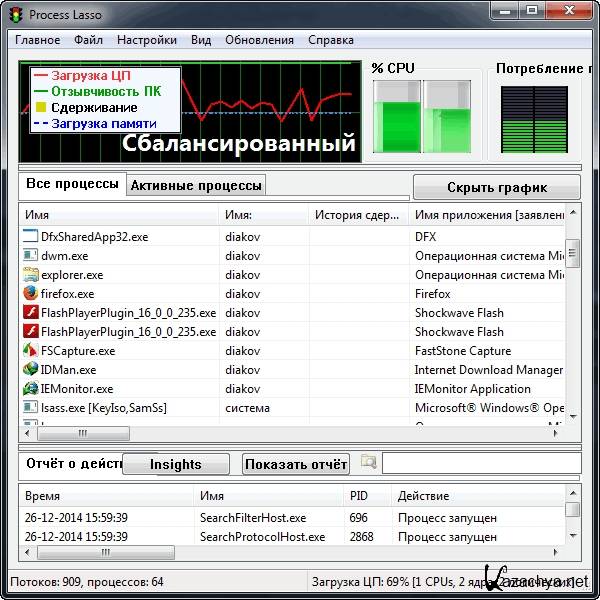 Windows по умолчанию, позволяет программам полностью загружать центральный процессор, что ведет к зависанию системы и, соответственно, к неудобству работы. Технология ProBalance (Process Balance) программы Process Lasso аккуратно перераспределяет приоритеты запущенных программ, так что процессы, которые ранее загружали весь центральный процессор, больше не будут влиять на отклик системы.