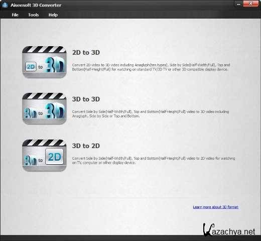 Aiseesoft 3D Converter — это специализированное приложение, которое предназначено для преобразования 3D и 2D видео-файлов на профессиональном уровне. Так же можно конвертировать 3D видео в 2D, 2D-видео в 3D-видео файлы, 3D видео в другие 3D режимы. Поддерживает большую часть известных видео форматов, таких как AVI, MP4, WMV, H.264, FLV, 3GP, MKV, RMVB, MOV, RM и так далее. Обеспечивает поддержку современной технологии NVIDIA CUDA, при помощи которой Вы сможете конвертировать видео ещё быстрее!