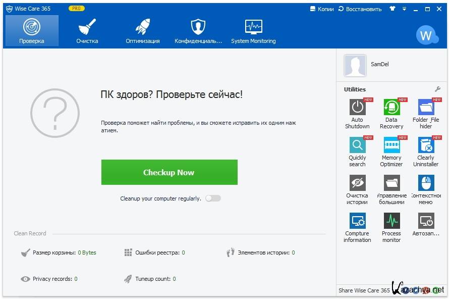 Wise Care 365 Pro - программный пакет, предназначенный для оптимизации, настройки и очистки компьютера. Способен быстро и безопасно произвести очистку системного реестра, освободить место на диске, дефрагментировать реестр и жесткий диск, восстановить удаленные файлы, блокировать приложения путем установки пароля на запуск, оптимизировать оперативную память, редактировать список автозагружаемых приложений и многое другое. Имеются дополнительные опции скрытия и шифрования важных файлов или папок, оптимизация компьютера "в один клик" и работа по расписанию.