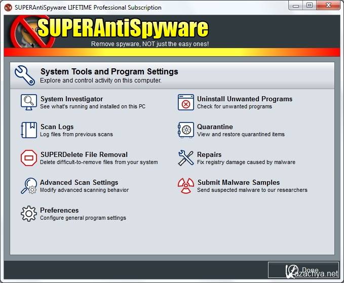 SuperAntiSpyware легко удаляет такое вредоносное ПО, как VirusRay, AntiVirGear, VirusProtectPro, DriveCleaner, SmitFraud, Vundo, WinFixer, SpyAxe, SpyFalcon, WinAntiVirus, Антипаразиты, AntiSpyGolden и еще более 1 млн. подобных угроз.