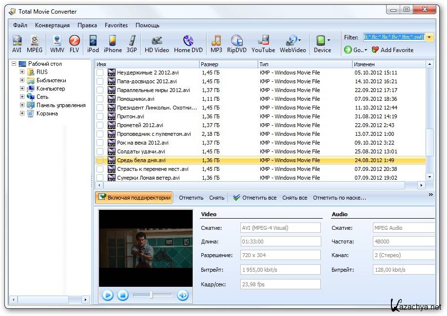 Coolutils Total Movie Converter - многофункциональная программа для конвертирования видео-файлов в любые известные форматы такие, как: AVI, MPG, WMV, MPEG, FLV. К тому-же, Total Movie Converter может подготовить видео для самых различных устройств - iPod, iPhone, Zune, Apple TV, Archos, Creative Zen Vision, XBox и многих других. Предусмотрена возможность пакетного конвертирования группы видеофайлов. Total Movie Converter поддерживает 3GP формат. Это позволит вам создать видео для любого мобильного телефона.