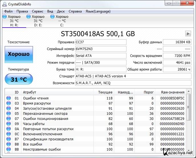 CrystalDiskInfo - это небольшая утилита для мониторинга состояния жестких дисков, отслеживает состояние жестких дисков, поддерживающих технологию S.M.A.R.T. Производит мониторинг и дает общую оценку "здоровья" вашего диска. Так же отображает детальную информацию о жестких дисках, установленных в компьютере (прошивка, серийный номер, стандарт, интерфейс, общее время работы и др.). Также выводит параметры атрибутов системы самодиагностики S.M.A.R.T. (ошибки чтения, производительность, запуски/остановки шпинделя, время поиска дорожки, количество циклов включения-выключения, ошибки секторов и многое другое).