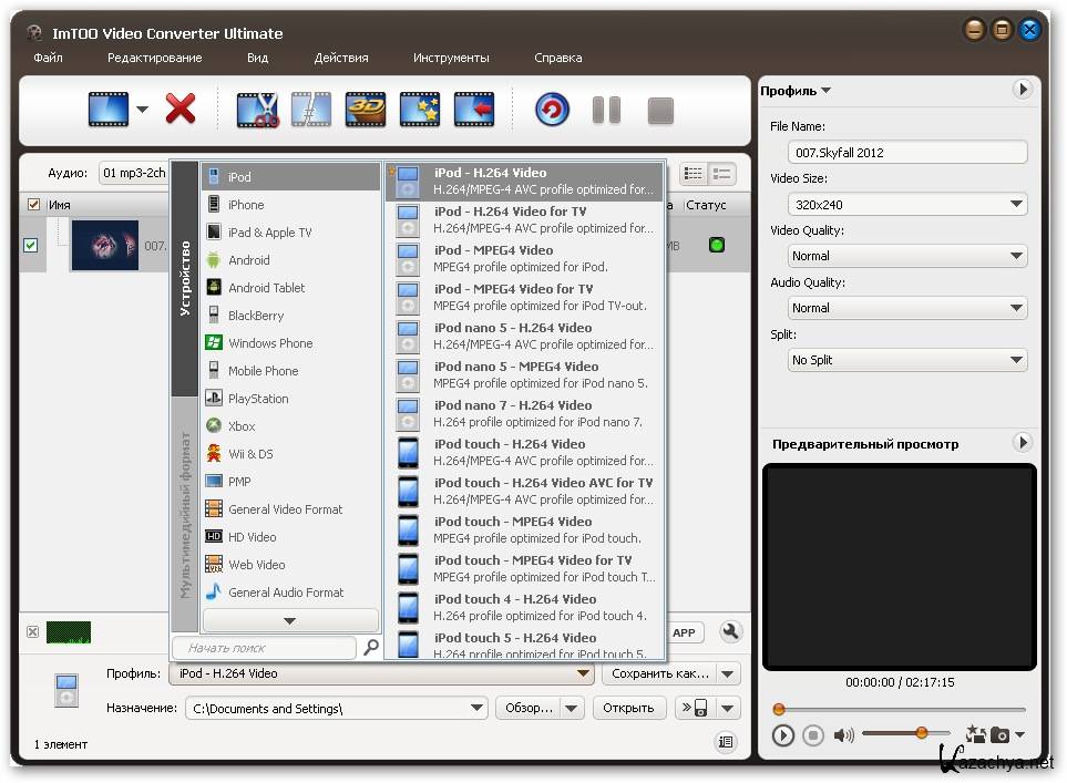 С ImTOO Video Converter Ultimate вы можете выбрать один или несколько видео или аудио файлов и адаптировать их к любым устройствам, и сделать это путем выбора определенного формата или один из профилей, предлагаемых программой, которые включает в себя мобильные телефоны, как BlackBerry, HTC, Motorola или Samsung, игровых консолей, таких как PlayStation 3, PSP или Wii и Apple, устройства, такие как iPad, iPod, iPhone или Apple TV.