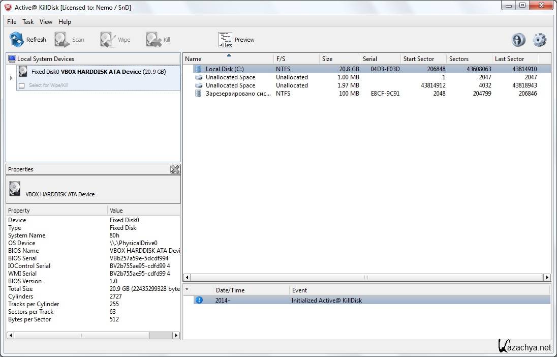 Active KillDisk Professional Suite - программа для надежного полного и безвозвратного удаления и безопасного форматирования всех данных с жесткого диска, включая файловые системы (NTFS, FAT32, FAT16 и FAT12) и логические разделы. Работает с диском через BIOS в прямом режиме DOS (с загрузочной дискеты) и перезаписывает каждый доступный сектор винчестера. Программа использует метод удаления данных US Department of Defense 5220.22 M. Запускать программу можно с загрузочной DOS-дискеты, флэш-карты или CD-привода. Доступ к данным осуществляется на физическом уровне через базовую систему ввода/вывода (BIOS), минуя структуру логических дисков.