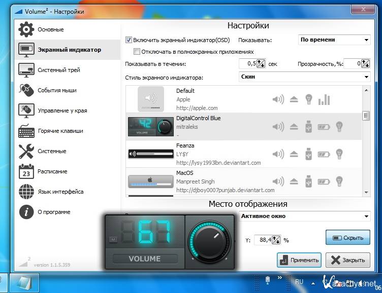 • Управление громкостью при вращении колесика мыши над: иконкой в трее, панелью задач, треем, рабочим столом, заголовком окна.