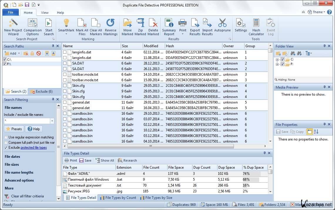 Duplicate File Detective - программа для удаления дубликатов файлов. Она позволяет сканировать папки, разделы жесткого диска, съемные носители, а также папки, находящиеся на общем доступе в сети. Все найденные файлы сортируются по расширениям, а при отображении статистики отображаются графики по типам найденных файлов. Полученные результаты можно экспортировать в форматы HTML, CSV и XML. Duplicate File Detective обладает интуитивно понятным интерфейсом, а также содержит большие возможности по сортировке полученных результатов.