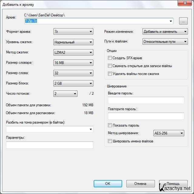 • Поддерживаемые алгоритмы: LZMA, LZMA2, PPMd, Bzip2, Deflate и Deflate64