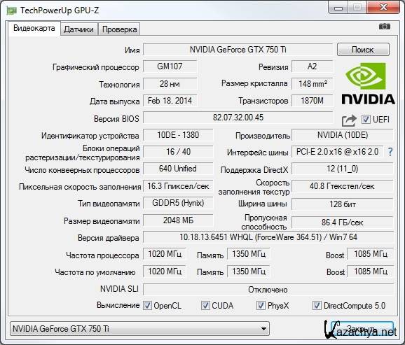 GPU-Z подойдет пользователям которые хотят разогнать свою видеокарту, так как можно в режиме реального времени контролировать ее параметры. Также имеется вкладка под названием Валидация, с ее помощью вы сможете отправить свой результат разгона на web-сайт и дополнить его комментарии, это достаточно удобно, можно просмотреть результаты других пользователей. Утилита умеет считывать различные показатели с датчиков, вы сможете узнать температуру карту, скорость куллера и прочие другие необходимые параметры. GPU-Z поддерживает карты NVIDIA и AMD-ATI.