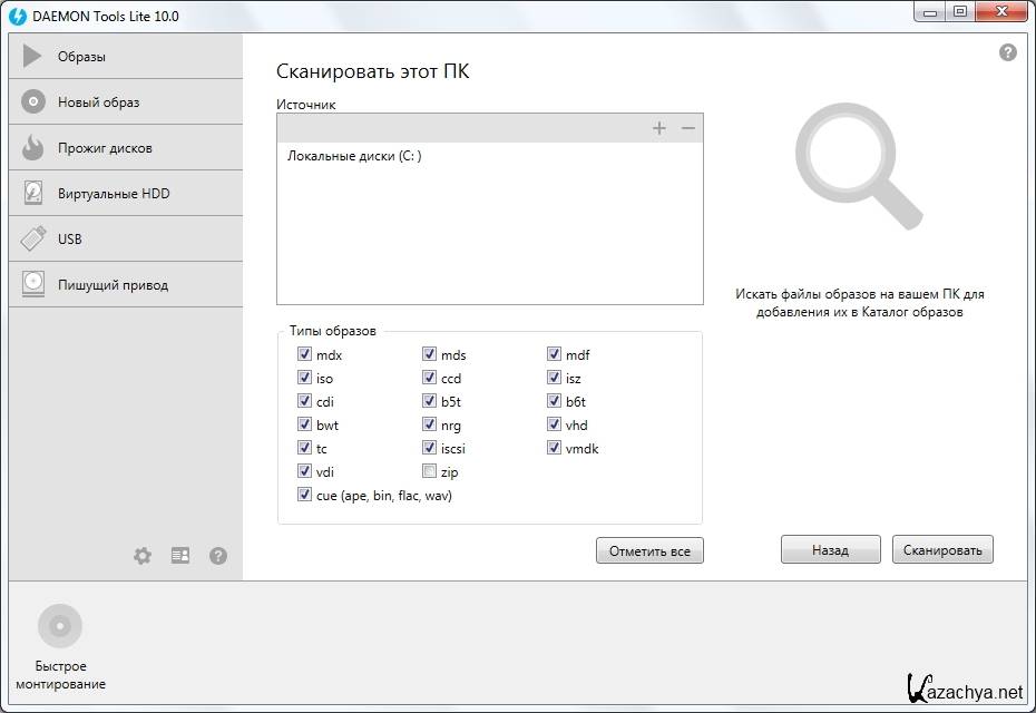 • Монтирование *.mdx, *.mds/*.mdf, *.iso, *.b5t, *.b6t, *.bwt, *.ccd, *.cdi, *.bin/*.cue, *.ape/*.cue, *.nrg, *.pdi, *.isz образов на виртуальные приводы