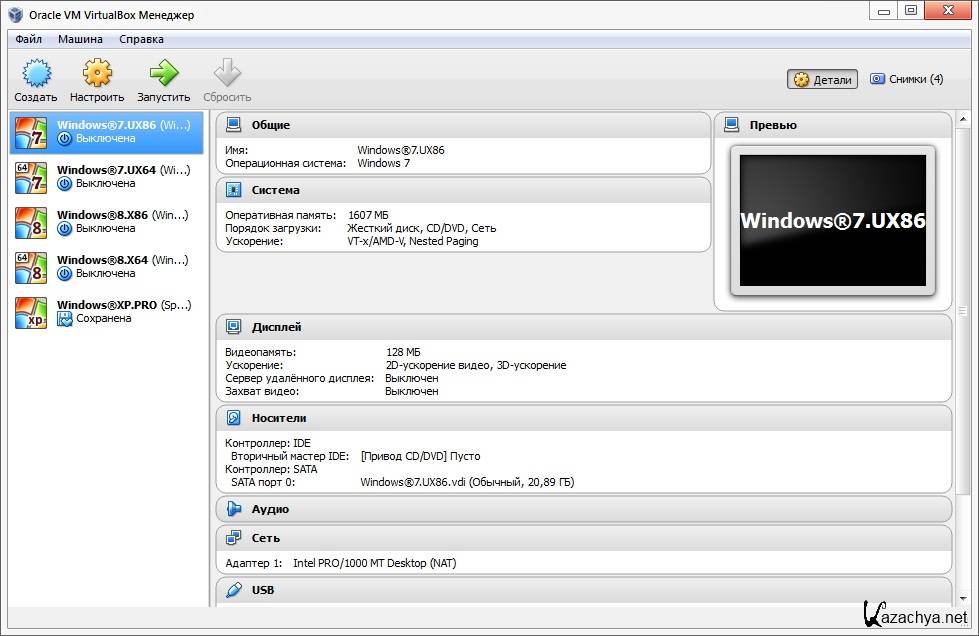 - Параметры виртуальных машин описываются в формате XML и никак не зависят от того физического компьютера, на котором система работает. Поэтому виртуальные компьютеры формата VirtalBox легко переносить с одного ПК на другой.