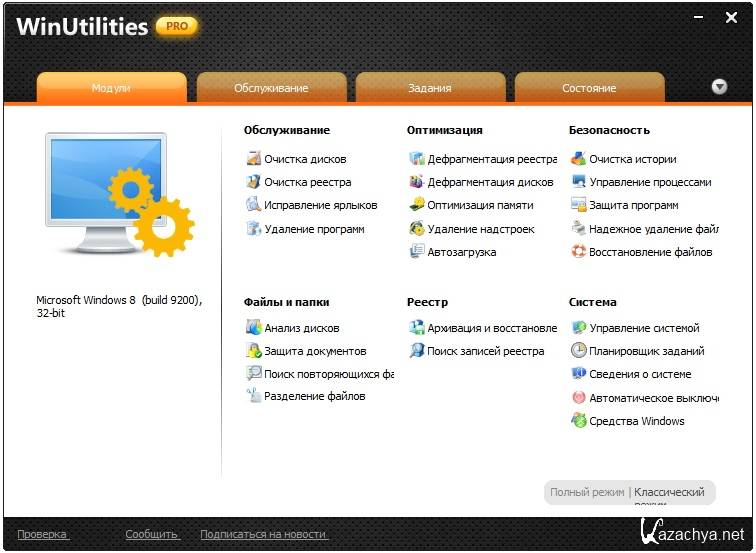 WinUtilities Pro - это мощнейшая программа с большим набором утилит для быстрой комплексной настройки и оптимизации операционной системы Windows. В состав пакета включено более 20 приложений выполняющих разнообразные функции. Возможности программы WinUtilities огромны, перечислив лишь некоторые из них: оптимизация и очистка системного реестра, очистка жестких дисков от мусорных файлов и файлов дубликатов, дефрагментация жестких дисков и реестра, восстановление случайно удаленных файлов, оптимизация оперативной памяти и интернет соединения, шифрование Exe файлов паролем, корректное удаление установленных приложений и многое многое другое.