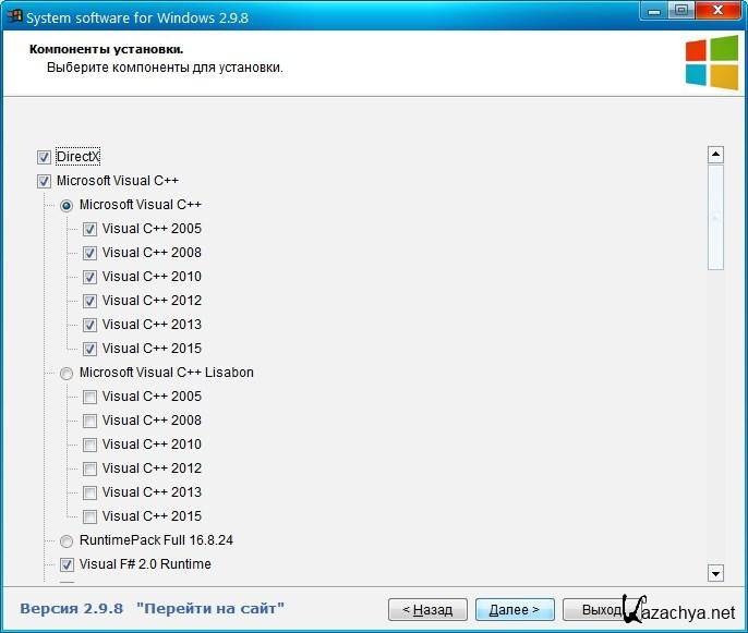 • Microsoft Visual С++ (2005-2008-2010-2012-2013-2015 x86 и x64 + Visual Studio 2010 F# Runtime 2.0 + F# Runtime 4.0 + Visual Basic 6.0 Extended Runtime + Visual J# 2.0 Redistributable Package + Visual Basic 7 Runtime)