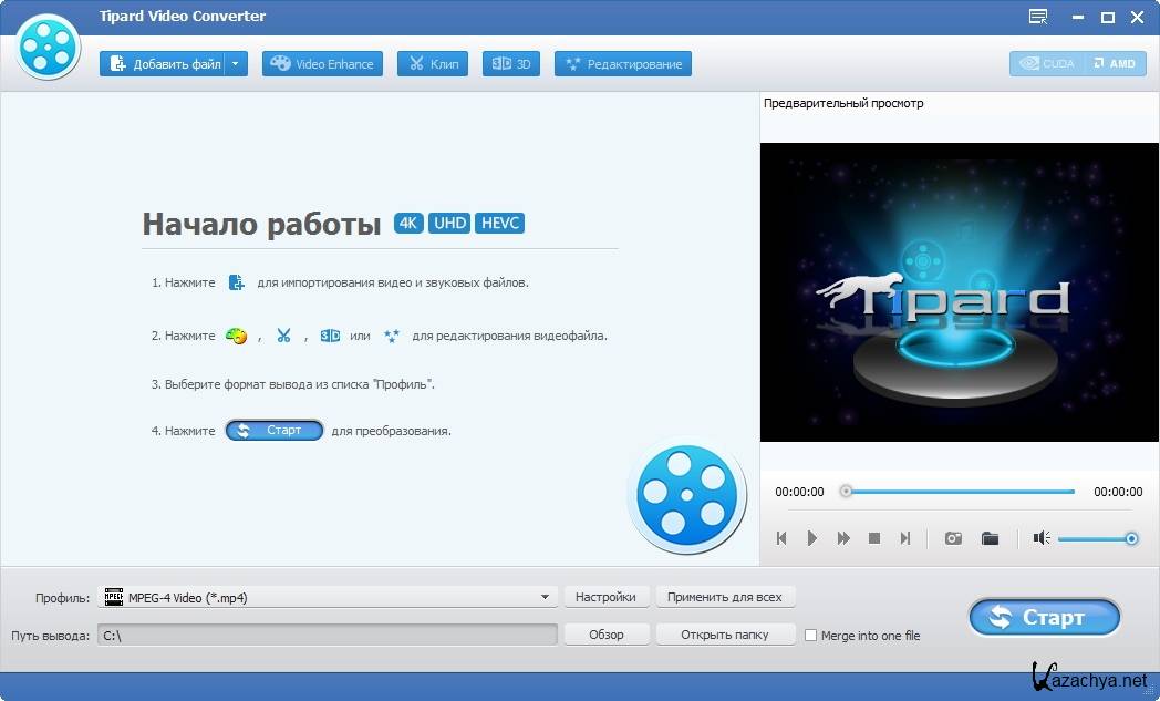 Tipard Video Converter - профессиональный конвертер видео файлов: MPG, MPEG, MPEG2, VOB, MOD, MP4, H.264, AVI, WMV и др. Также он может извлекать аудио из видео и конвертировать его в M4A, MP3, AC3, AAC, WMA, WAV, OGG. Преобразованные файлы можно просматривать на iPad, iPad 2, iPod, iPhone, iPhone 4, Apple TV, PSP, PS3, Wii, Zune, Xbox, Sony Walkman, Google Phone, BlackBerry и других. Кроме того, после комплексного обновления и модернизации программы она поддерживает технологии NVIDIA CUDA и AMD APP, добавлена поддержка видео WebM и HD видео.