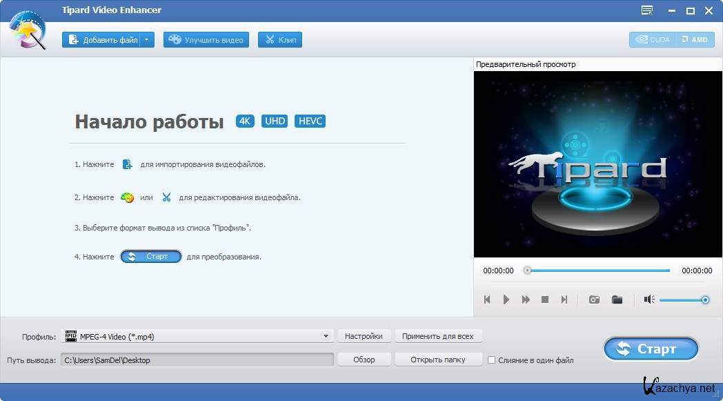 Tipard Video Enhancer - обеспечивает улучшение качества отснятого видео материала, удаляет фоновый шум, убирает или сглаживает артефакты. Располагает самой передовой технологией, позволяющей повысить видео низкого разрешения до более высоких значений. Например, Вы можете достичь разрешения от 480p до 720p, 720p до 1080p, и 1080p преобразовать в 4K. Поддерживает форматы 4K, UHD, HEVC, поможет быстро и с хорошим качеством провести обработку Вашего видео, используя современные технологии AMD и NVIDIA CUDA.