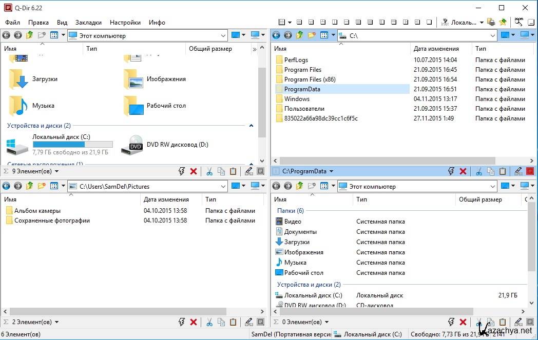 Q-Dir - это отличный файловый менеджер с четырехпанельным интерфейсом и большими возможностями для работы с файлами. Q-Dir сделает работу с вашими папками и файлами очень легкой.Легкий и быстрый, с удивительной Quadro-View технологией. вам не надо отказываться от простого, перетаскивания и других удобных возможностей системы. Q-Dir дает вам огромное множество полезных возможностей.