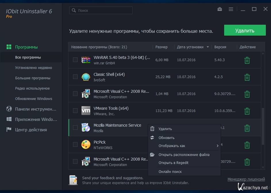 IObit Uninstaller Pro - поможет вам быстро и без усилий удалить ненужные программы и папки с вашего компьютера.Там, где встроенный неповоротливый диалог «Установка и удаление программ» не справляется с возложенной на него задачей, IObit Uninstaller принимает эстафету, эффективно выполняя свою работу. Более того, это бесплатная утилита для деинсталляции программ, сама по себе не требующая установки.
