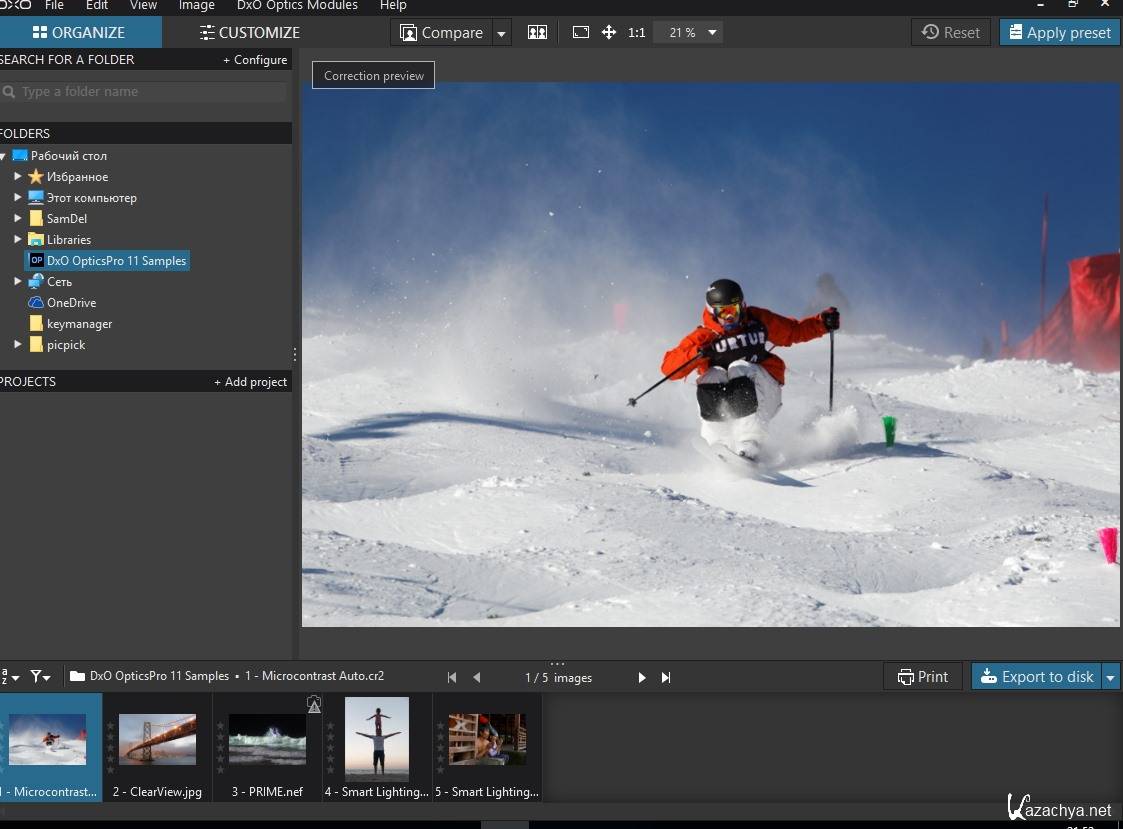 DxO Optics Pro - профессиональное приложение, способное улучшить и скорректировать вашу коллекцию цифровых фотографий. DxO Optics Pro содержит множество прогрессивных технологий, с помощью которых можно настроить яркость, контрастность, цветовой баланс, избавиться от искажений и повысить четкость изображений, исправить цвета и экспозицию по краям и в углах фотографии, отрегулировать баланс белого цвета с учётом цветовой температуры и многое другое.