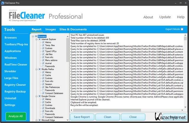Данный клинер поддерживает работу с всеми известными браузерами (Google Chrome, Opera, Mozilla Firefox, IE и др.), очищая историю серфинга, временные файлы, куки, кеш, журнал, пароли. То что касается самой операционки Windows, в таком случае здесь можно почистить буфер обмена, логи, историю запросов, Корзину, недавно используемые документы и др. разделы. Кроме того целесообразно указать, то что FileCleaner результативно справляется с удалением тулбаров и плагинов.